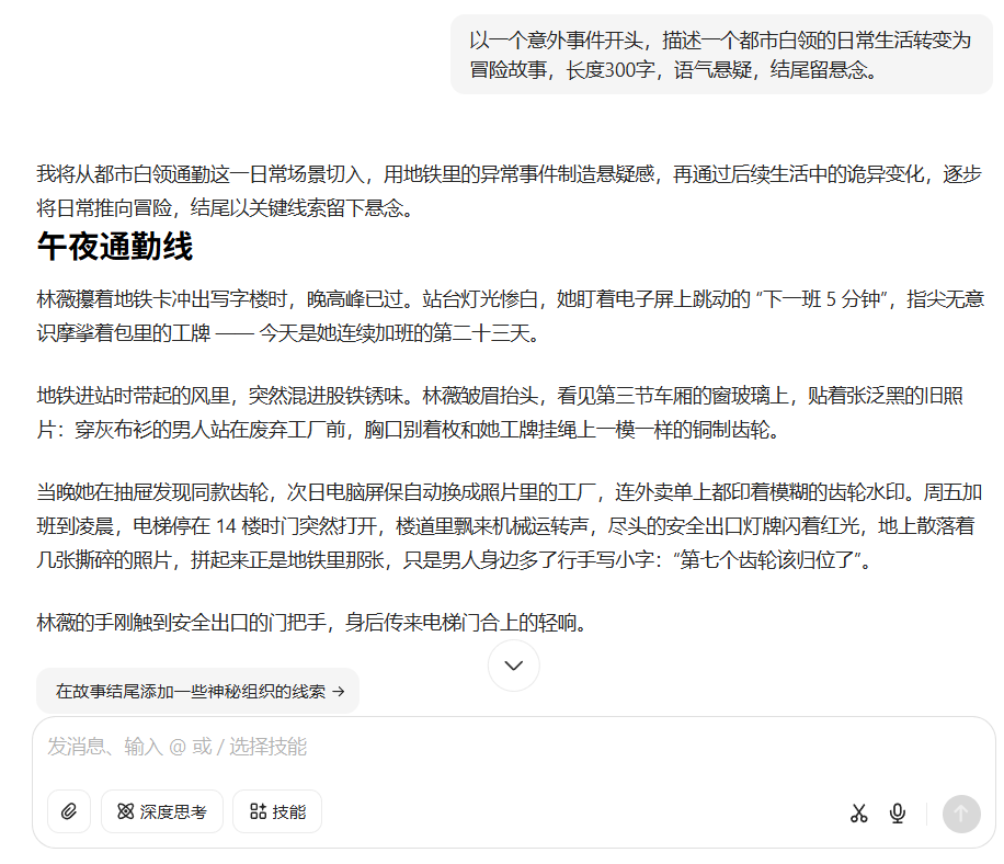 - 故事开头提示词: “以一个意外事件开头,描述一个都市白领的日常生活转变为冒险故事,长度300字,语气悬疑,结尾留悬念。” 这个豆包AI写作提示词帮我写过短篇,AI生成的开头总有惊喜,避免千篇一律。