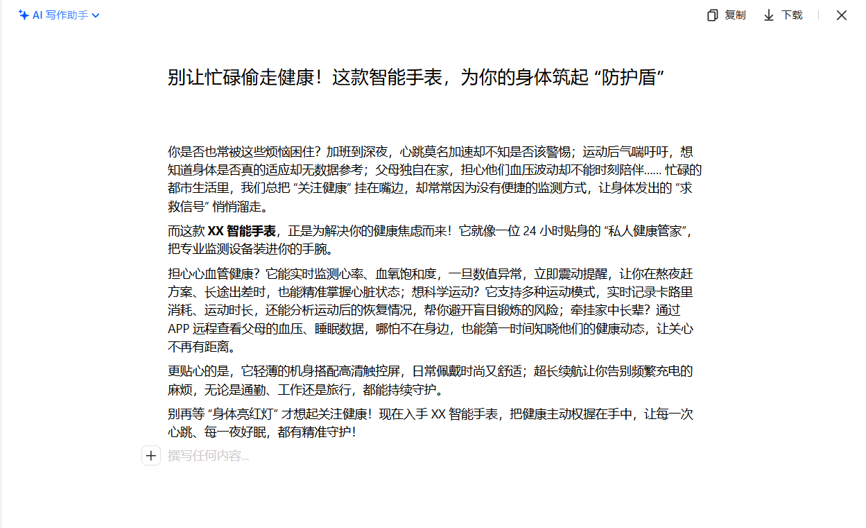 - 营销文案提示词: “写一篇产品推广文案,针对智能手表,突出健康监测功能,500字,语气热情说服,包含用户痛点和解决方案。” 这个豆包AI写作提示词生成的内容直接可用,我改改就发朋友圈。